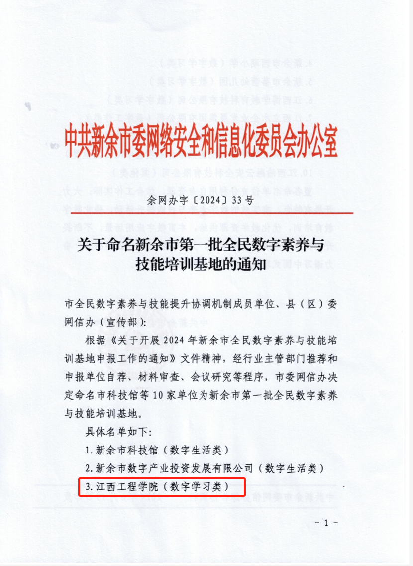 2024年6月19日,中共新余市委網(wǎng)絡安全和信息化委員會辦公室發(fā)布新余市第一批全民數(shù)字素養(yǎng)與技能培訓基地名單,我校成功入選“新余市全民數(shù)字素養(yǎng)與技能培訓基地(數(shù)字學習類)”名單,標志著我校全民數(shù)字素養(yǎng)與技能提升走在行業(yè)前列。