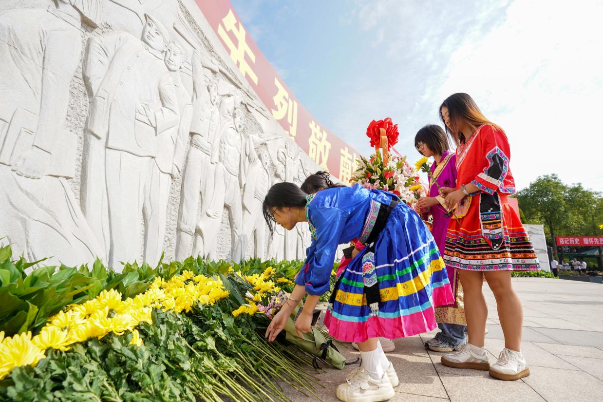 默哀畢,隊伍緩緩移動,繞紀念碑而行。目光撫過碑身的刻痕,碑面上投下的細碎光影,仿佛先輩們無聲的注視。這份歷史的厚重與精神的力量相交織,在心底沉淀出繼續(xù)前行的信念。獻花者手捧素雅花束,在墓前碑旁躬身佇立。花束輕置,空氣仿佛靜止。以這靜默的儀式,讓哀思隨花香漫過青石板,滲入黃土下的忠魂。每一束花都是一座橋梁,連接起古今,讓“不朽”二字,在寂靜中愈發(fā)清晰。