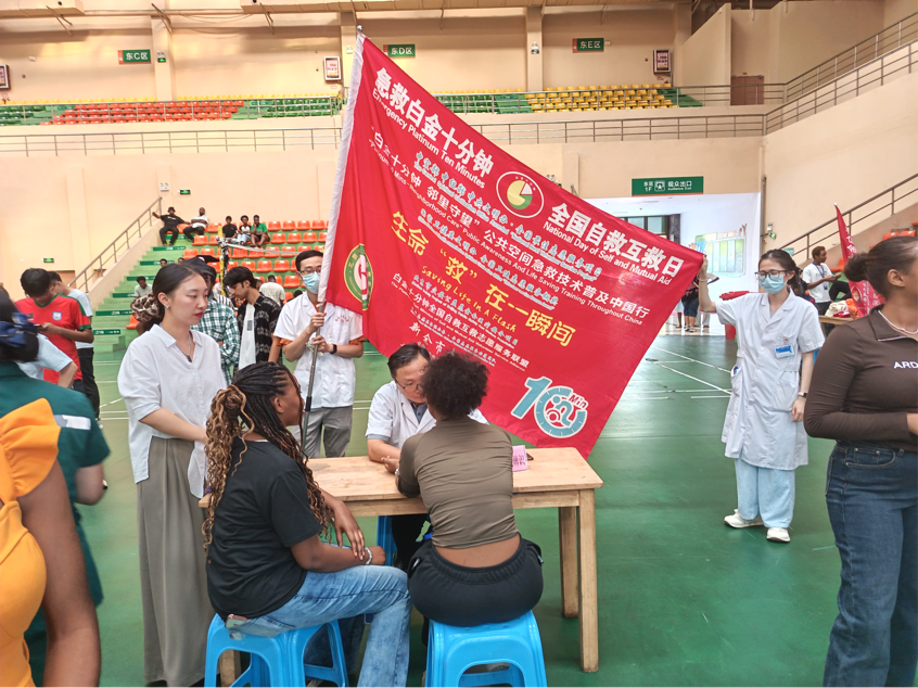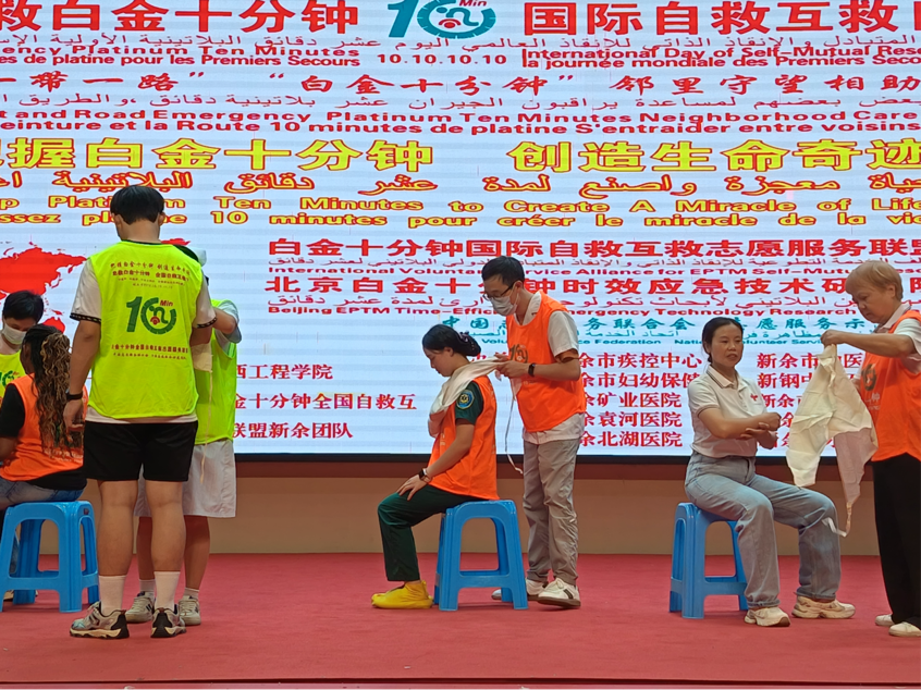 活動(dòng)的第二大部分“健康新余暨白金十分鐘科普活動(dòng)” 將現(xiàn)場(chǎng)氣氛推向高潮。在專(zhuān)業(yè)醫(yī)護(hù)人員的主導(dǎo)下,現(xiàn)場(chǎng)分別設(shè)置了成人心肺復(fù)蘇和AED使用、解除氣管異物梗阻(海姆立克急救法)、大懸臂帶包扎等多個(gè)實(shí)操演示與體驗(yàn)區(qū)。來(lái)自新余市人民醫(yī)院、中醫(yī)院、紅十字服務(wù)中心等單位的醫(yī)護(hù)人員同臺(tái)演示,步驟清晰,講解專(zhuān)業(yè)。演示結(jié)束后,我校留學(xué)生們被特邀上臺(tái),在專(zhuān)家的一對(duì)一指導(dǎo)下進(jìn)行實(shí)踐操作,親身學(xué)習(xí)掌握了多項(xiàng)關(guān)鍵的急救技術(shù)?;顒?dòng)現(xiàn)場(chǎng)還同步開(kāi)展了專(zhuān)家義診和面向所有參與者的臺(tái)下技術(shù)傳授,形成了“人人學(xué)急救”的生動(dòng)場(chǎng)面。