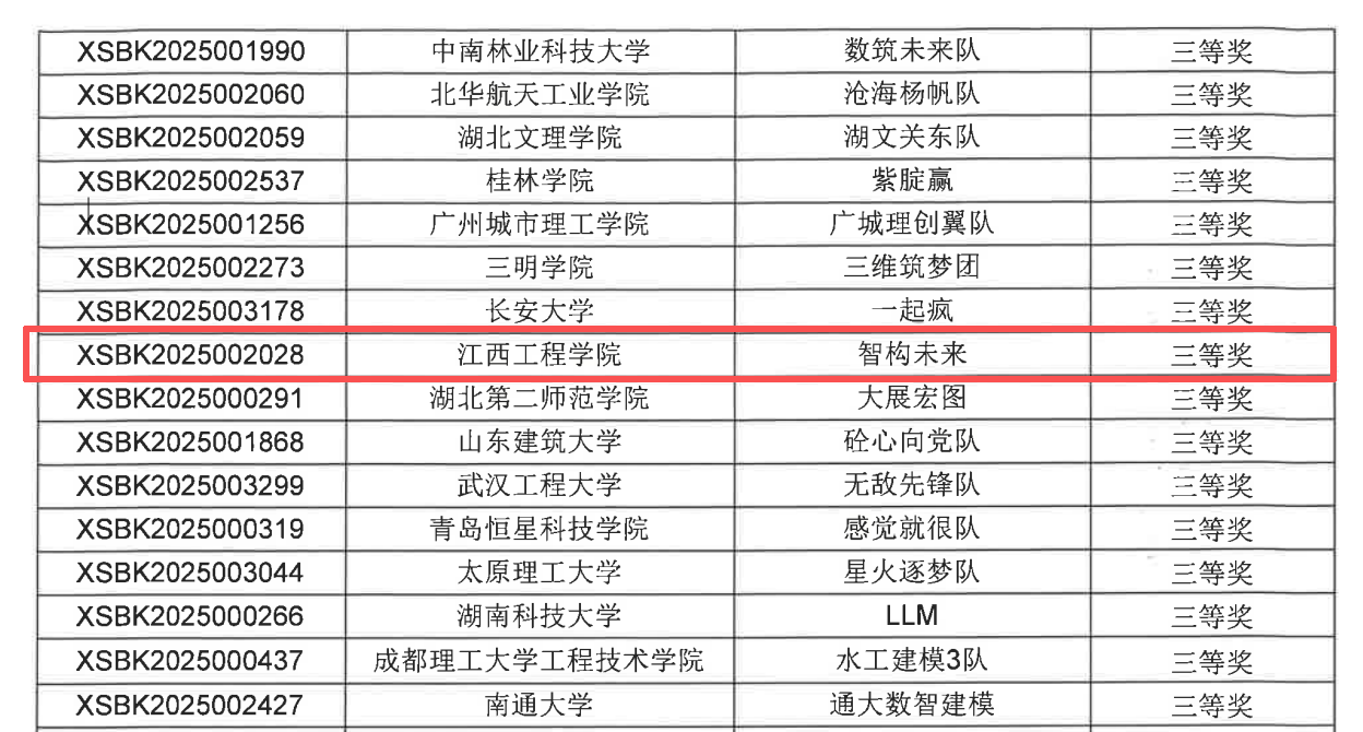 此次獲獎既是學(xué)校在數(shù)字建筑領(lǐng)域?qū)W科競賽的重大突破,也是江西工程學(xué)院智能制造與建造學(xué)院“工學(xué)主導(dǎo)、產(chǎn)教融合”辦學(xué)特色的生動彰顯。下一步,學(xué)院將以此次獲獎為契機,深化“以賽促學(xué)、以賽促教、以賽促創(chuàng)”育人機制,持續(xù)完善數(shù)字建筑領(lǐng)域?qū)嵺`教學(xué)體系,搭建更高水平學(xué)科競賽平臺,鼓勵更多學(xué)子投身創(chuàng)新實踐,為建筑行業(yè)高質(zhì)量發(fā)展培育更多兼具創(chuàng)新精神與實踐能力的復(fù)合型人才。