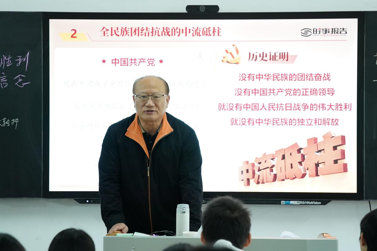 劉新躍以紀(jì)念中國人民抗日戰(zhàn)爭暨世界反法西斯戰(zhàn)爭勝利80周年大會為切入點,帶領(lǐng)同學(xué)們回顧了波瀾壯闊、艱苦卓絕的十四年抗戰(zhàn)歲月,深刻指出中國共產(chǎn)黨是全民族團結(jié)抗戰(zhàn)的中流砥柱。他強調(diào),抗日戰(zhàn)爭的偉大勝利不僅洗刷了近代以來的民族恥辱、重鑄了中國的大國地位、開辟了民族復(fù)興的光明前景,更在血與火的考驗中鑄就了偉大的抗戰(zhàn)精神?!斑@一寶貴的精神財富,是激勵我們克服一切艱難險阻、向著偉大復(fù)興目標(biāo)奮勇前行的強大動力。”劉新躍寄語青年學(xué)子,作為民族復(fù)興主力軍,要在學(xué)習(xí)中錘煉本領(lǐng),在實踐中堅定信念,讓抗戰(zhàn)精神成為奮進路上的不竭動力。