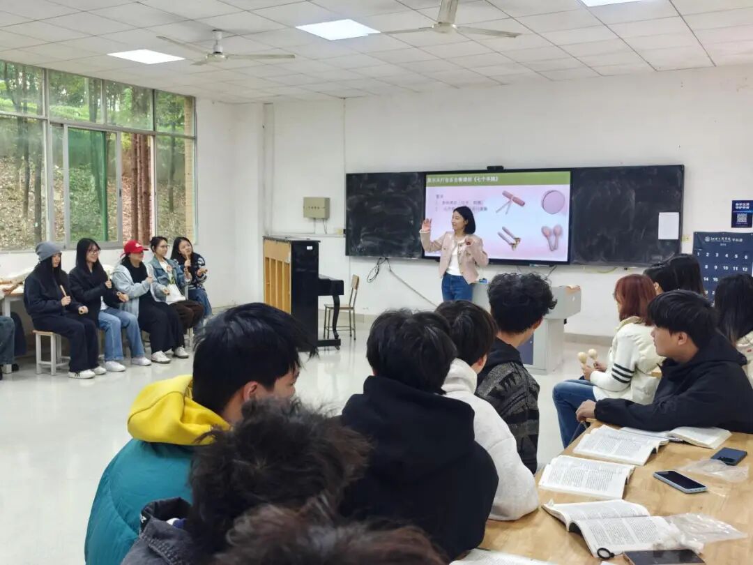 課堂上,何家潔老師以“音樂教育中的跨學科融合”為主題,通過“理論講授+案例分析+互動實踐”三位一體的教學模式,引導學生探討音樂與文學、舞蹈等藝術形式的融合路徑。她以《吉祥三寶》為切入點,結合多媒體視頻、現(xiàn)場樂器演示及即興創(chuàng)作,生動呈現(xiàn)了音樂教育在傳承文化、激發(fā)創(chuàng)造力中的獨特價值。學生們積極參與課堂討論,圍繞“如何將傳統(tǒng)音樂元素融入現(xiàn)代教學”等議題展開熱烈辯論,課堂氣氛活躍。