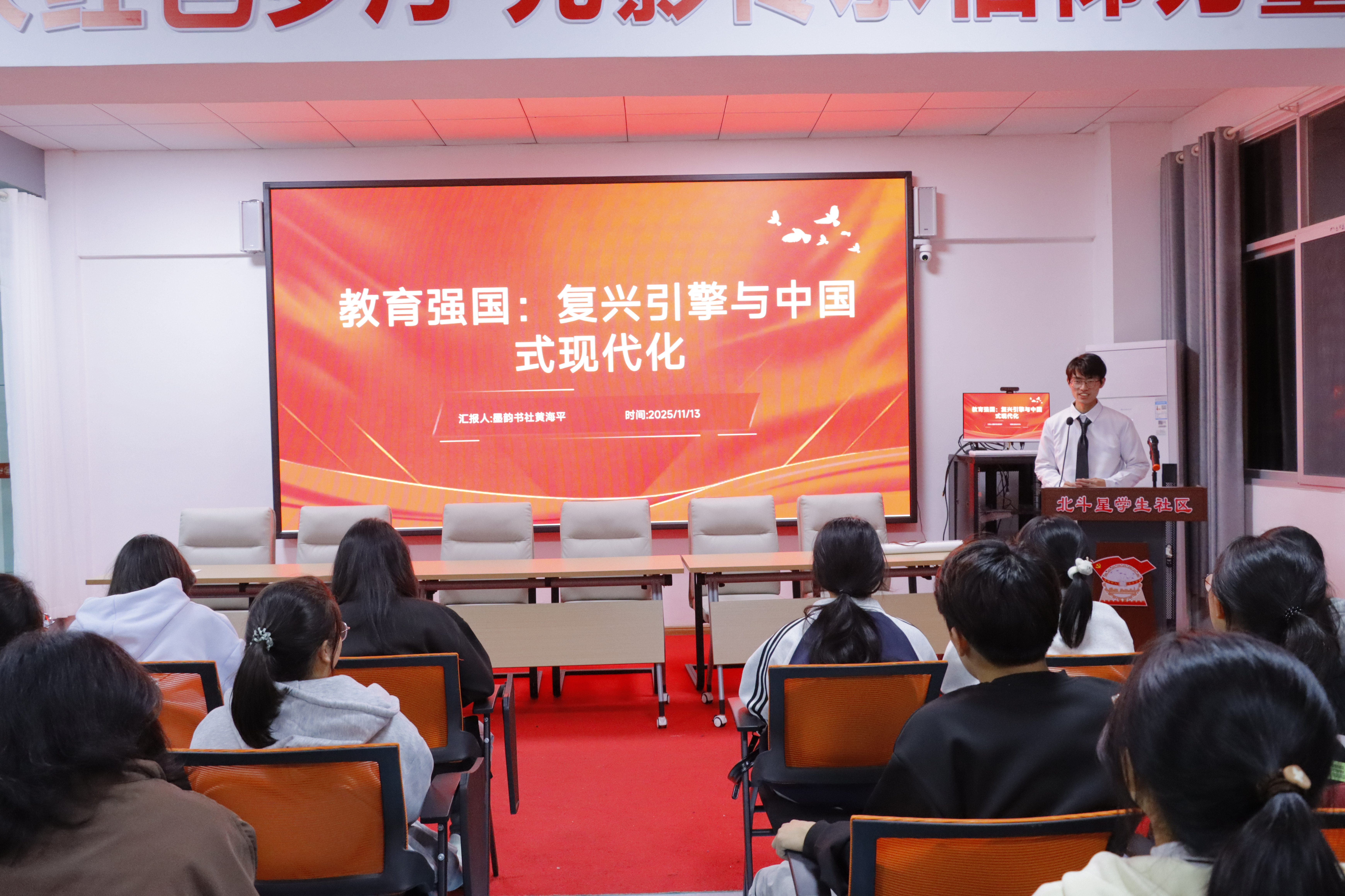 11月13日,“北斗星?天工夜話”第13期活動在江西工程學院“一站式”學生社區(qū)如期舉行。本次宣講以“身邊事”解讀“大政策”,真正實現(xiàn)“聲入人心、情入人心、理入人心”。活動特別邀請江西工程學院馬克思主義學院教師劉彩蕓、墨韻書社負責人黃海平擔任宣講嘉賓,經濟管理學院60余名學生參與其中。