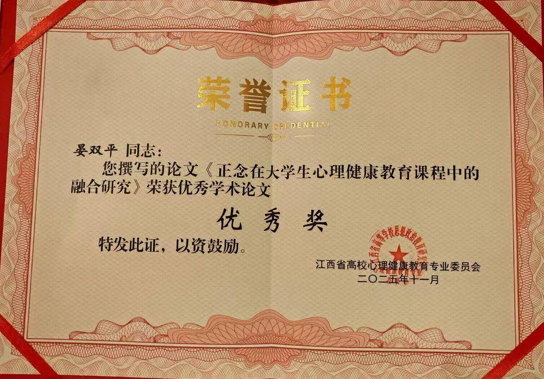 晏雙平老師撰寫的論文《正念在大學(xué)生心理健康教育課程中的融合研究》榮獲優(yōu)秀學(xué)術(shù)論文“優(yōu)秀獎(jiǎng)”。該論文深入探討了正念在大學(xué)生心理健康教育課程中的應(yīng)用與融合,為心理健康教育課程的教學(xué)改革和創(chuàng)新提供了新的思路和方法,具有較高的理論價(jià)值和實(shí)踐指導(dǎo)意義。