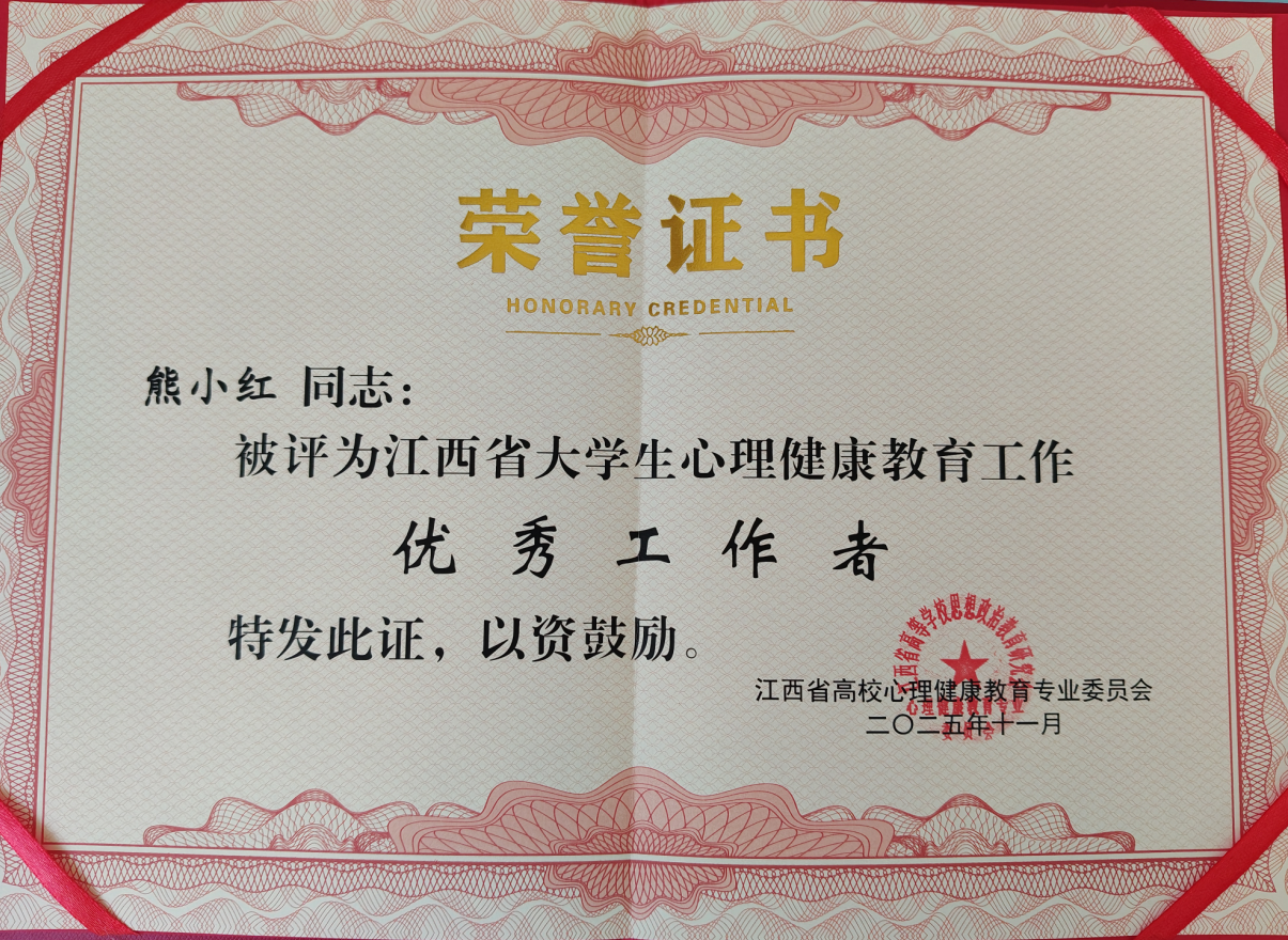 熊小紅老師憑借其在心理健康教育工作中的出色表現(xiàn),被評(píng)為江西省大學(xué)生心理健康教育工作“優(yōu)秀工作者”。熊小紅老師長(zhǎng)期投身于心理健康教育工作,以高度的責(zé)任心和敬業(yè)精神,時(shí)刻關(guān)注學(xué)生的心理動(dòng)態(tài),積極開展各種心理健康教育活動(dòng),為學(xué)生提供了及時(shí)、有效的心理支持和引導(dǎo),在校園內(nèi)營(yíng)造了關(guān)注心理健康、積極向上的良好氛圍。