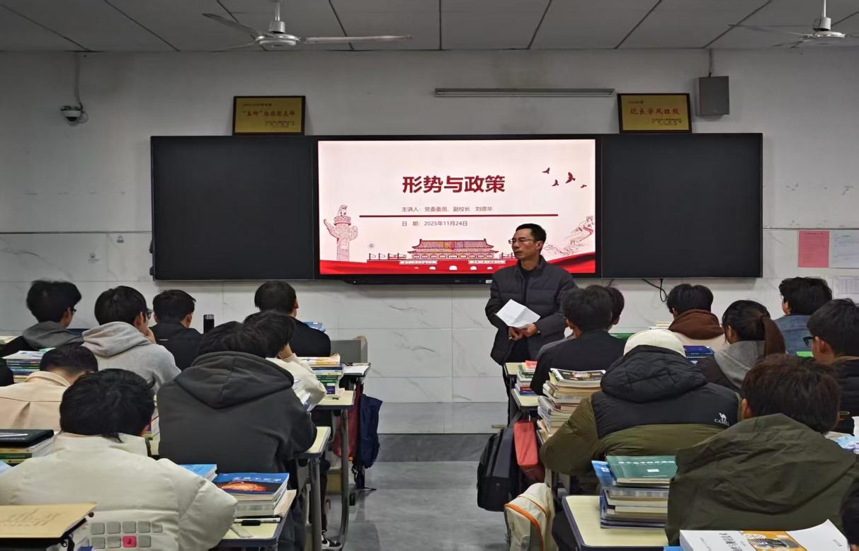 為深入學(xué)習(xí)貫徹習(xí)近平總書(shū)記關(guān)于思政課建設(shè)的重要論述,持續(xù)推動(dòng)思政課改革創(chuàng)新,發(fā)揮校領(lǐng)導(dǎo)示范引領(lǐng)作用。11月24日,校黨委委員、副校長(zhǎng)劉德華走進(jìn)2024級(jí)機(jī)械設(shè)計(jì)制造及其自動(dòng)化本科2班教室,為同學(xué)們帶來(lái)了一堂內(nèi)容豐富的“形勢(shì)與政策”課。